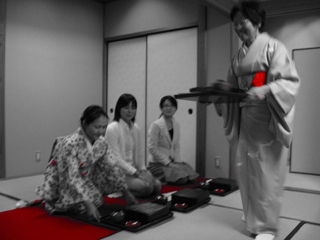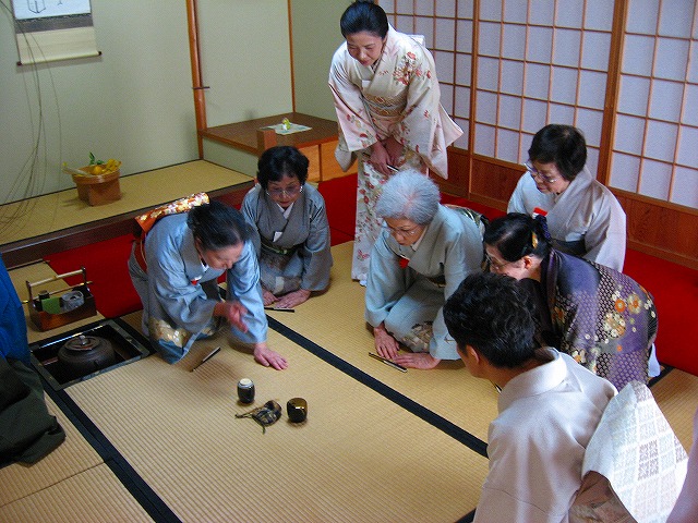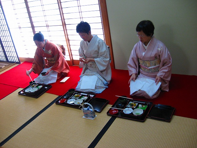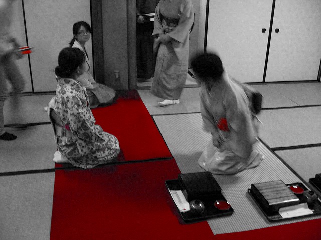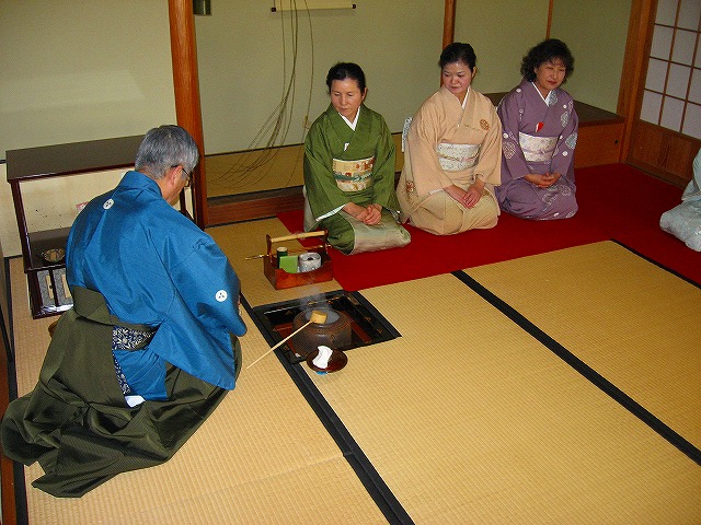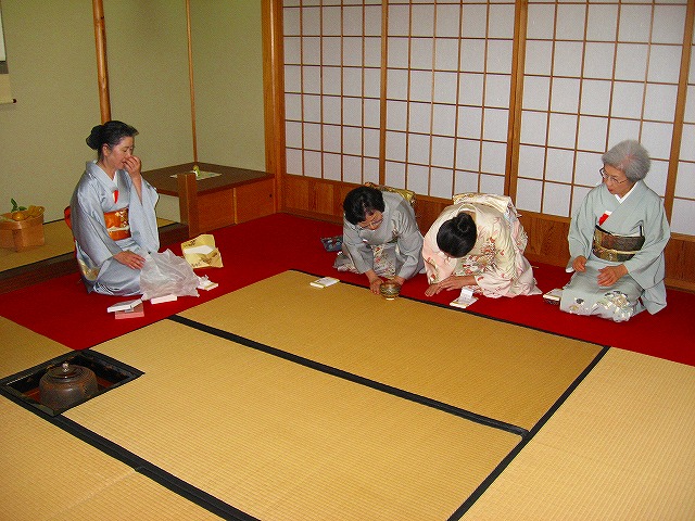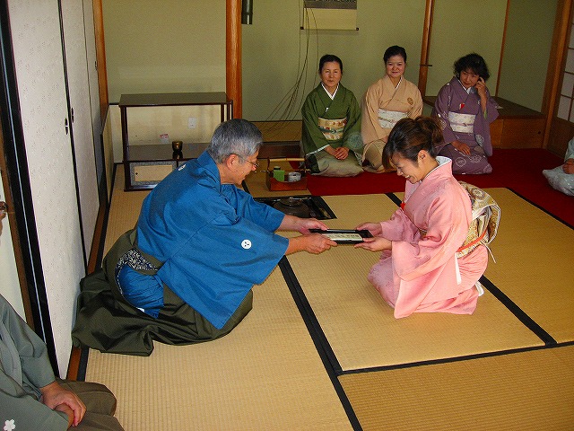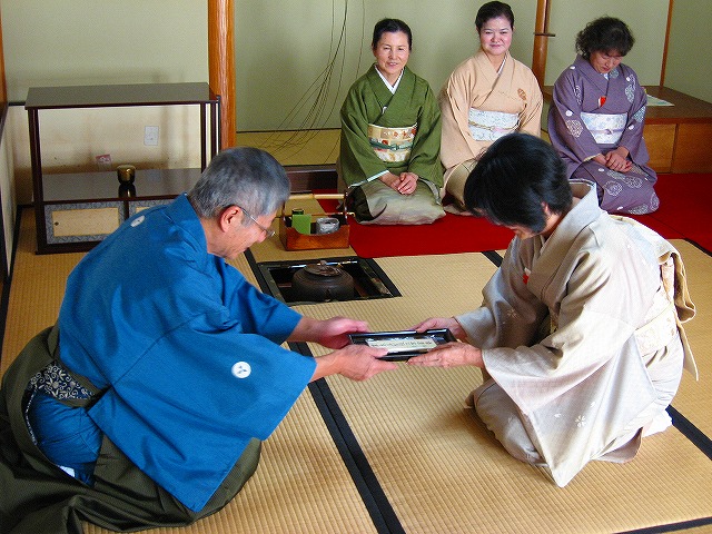 1.客が大勢の時は、「点て出し(たてだし)」といって、水屋の方で点(た)てたお茶碗が次々と客席へ運ばれてきます。
